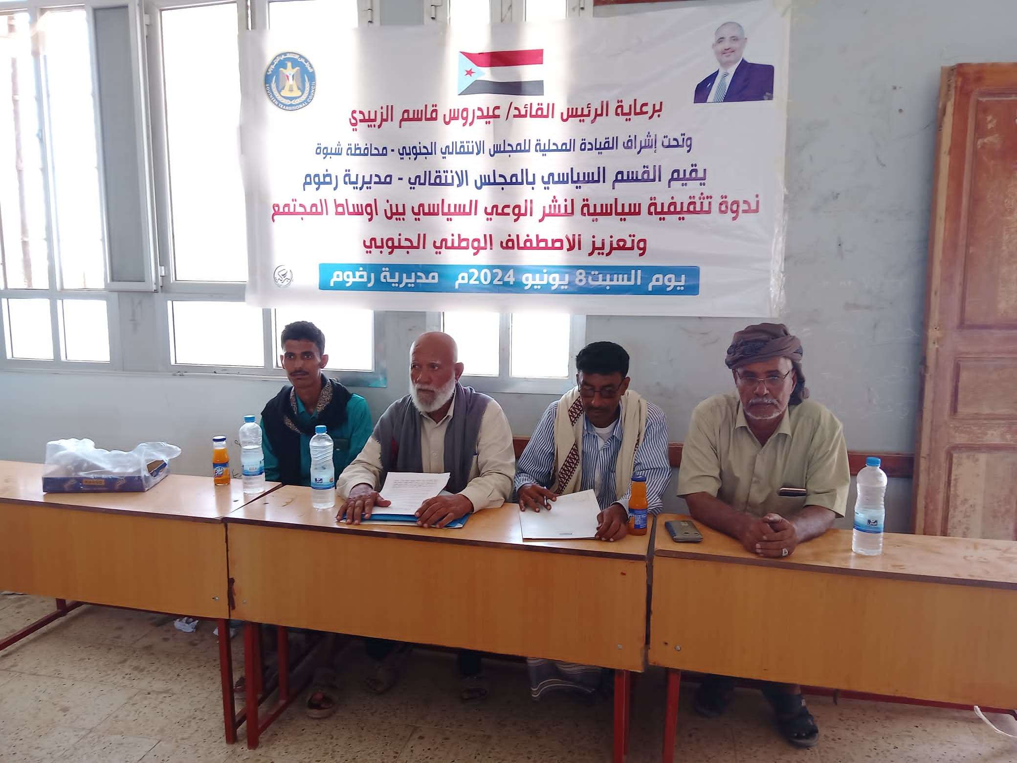 انتقالي رضوم ينظم ندوة سياسية حول تعزيز الاصطفاف الوطني ونشر الوعي السياسي بالمديرية نظم القسم السياسي بالهيئة التنفيذية للقيادة المحلية بالمجلس الانتقالي الجنوبي في مديرية رضوم، بمحافظ...