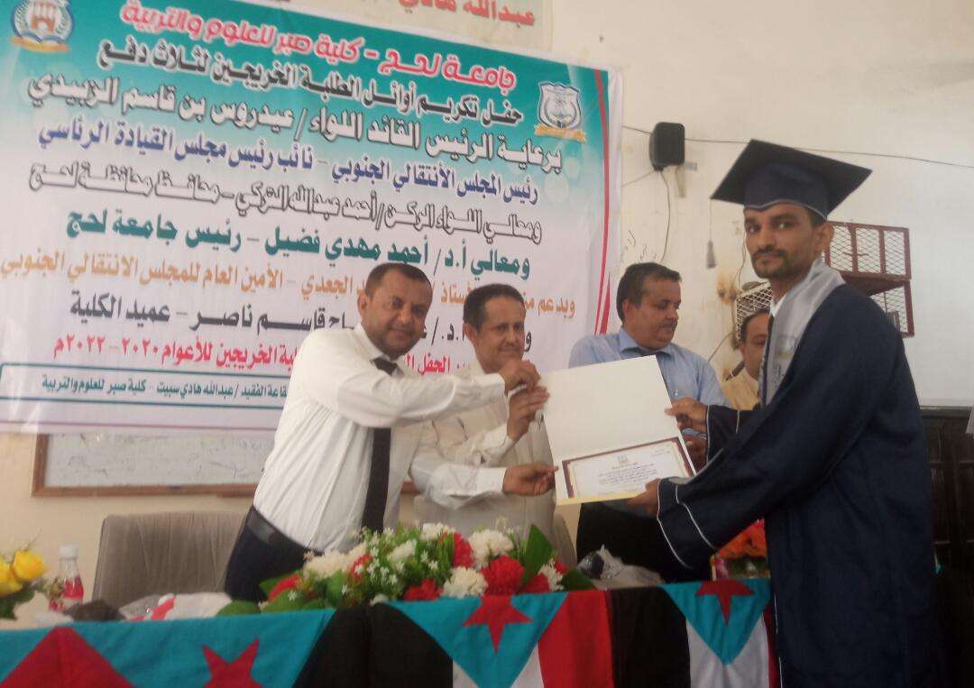 برعاية الرئيس الزُبيدي..كلية صبر تكرم أوائل الطلاب الخريجين للأعوام 2020-2022م نظمت كلية صبر للتربية والعلوم في جامعة لحج، اليوم الأحد، حفل تكريم لأوائل الطلاب الخريجين للأعوام 20...