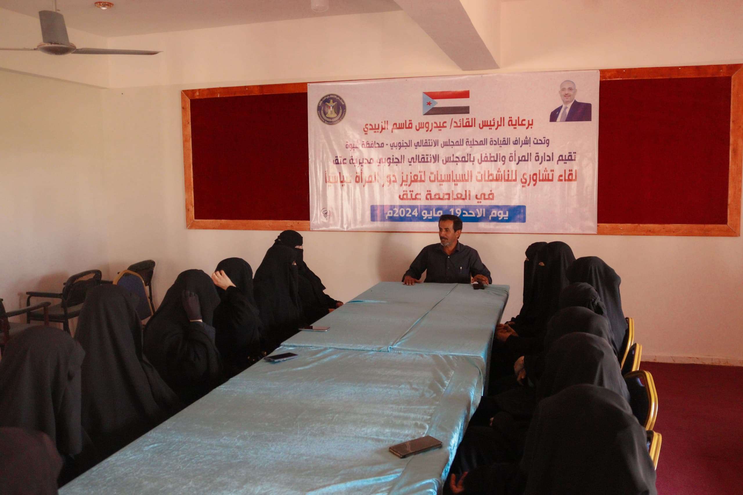 انتقالي عتق ينظم لقاءً تشاورياً مع عدد من الناشطات في المديرية نظم قسم المرأة والطفل بالهيئة التنفيذية للقيادة المحلية للمجلس الانتقالي الجنوبي في مديرية عتق بمحاف...