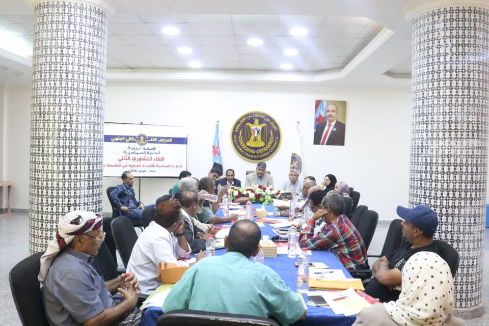 الدائرة السياسية تناقش خطط عمل الإدارات في الهيئات التنفيذية لانتقالي العاصمة عدن ومديرياتها عقدت الدائرة السياسية في الأمانة العامة لهيئة رئاسة المجلس الانتقالي الجنوبي، اليوم الأحد اجتم...