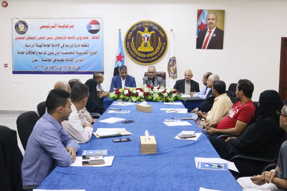 دشنت إدارة المراسم في الأمانة العامة لهيئة رئاسة المجلس الانتقالي الجنوبي اليوم الأربعاء، دورة تدريبية برعاية الرئيس القائد عيدروس الزُبيدي رئيس المجلس الانتقالي الجنوبي، تستمر ليومين، خاصة بفنون المراسم والعلاقات العامة، لكوادر القيادة المحلية للمجلس الانتقالي في العاصمة عدن.