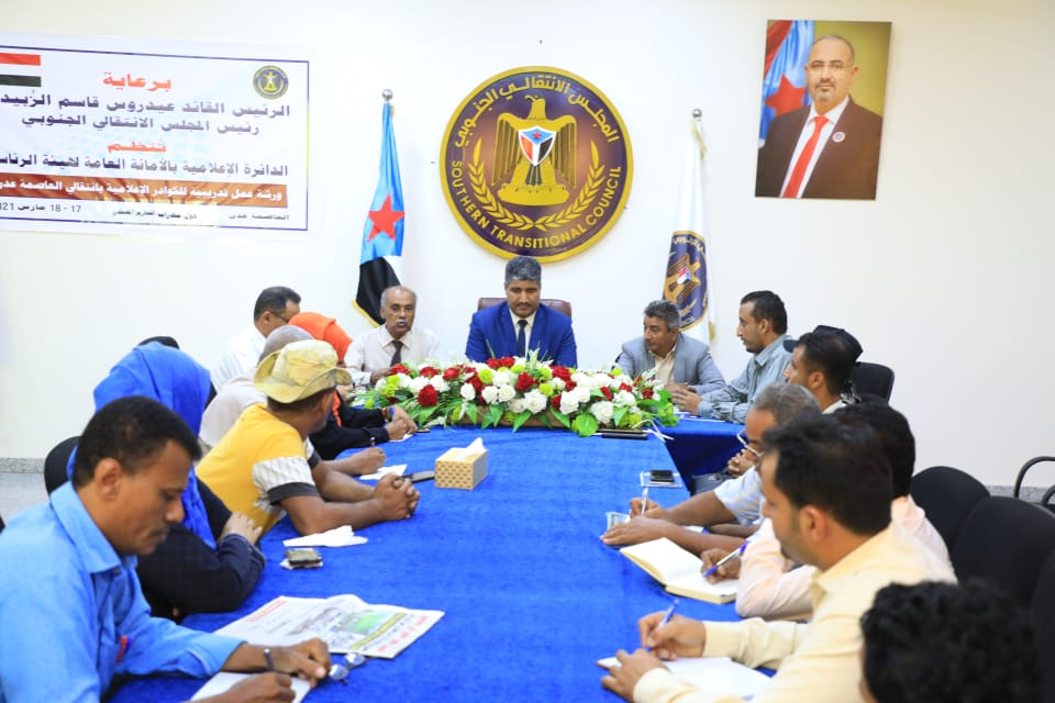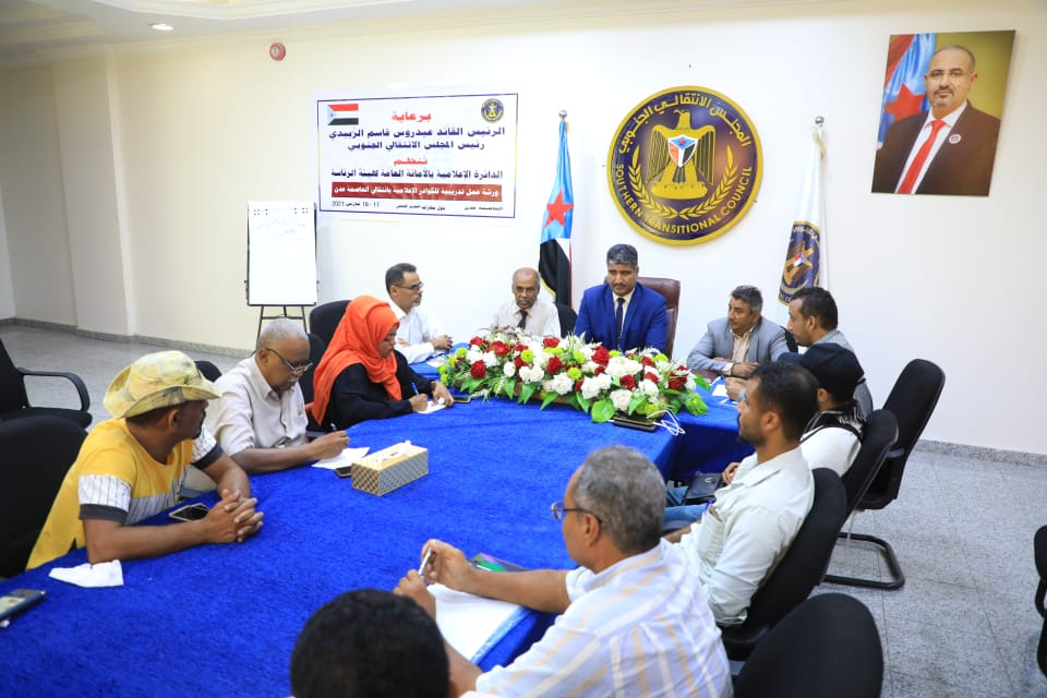 بدأت الدائرة الإعلامية في الأمانة العامة لهيئة رئاسة المجلس الانتقالي الجنوبي، اليوم الأربعاء ورشة عمل حول "مهارات التحرير الصحفي" شارك فيها 18 مشاركا من الكوادر الإعلامية بانتقالي العاصمة عدن، تستمر ليومين.