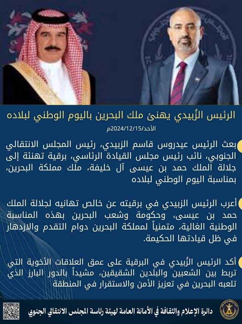 الرئيس الزُبيدي يهنئ ملك البحرين باليوم الوطني لبلاده