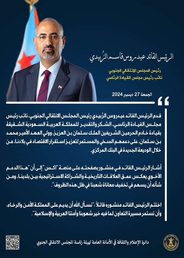 الرئيس الزُبيدي يشكر قيادة المملكة العربية السعودية على الدعم المستمر لدعم استقرار الاقتصاد في بلادنا