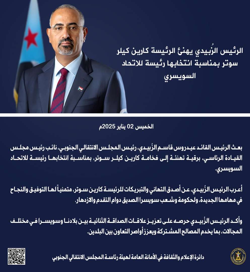الرئيس الزُبيدي يهنئ الرئيسة كارين كيلر سوتر بمناسبة انتخابها رئيسة للاتحاد السويسري
