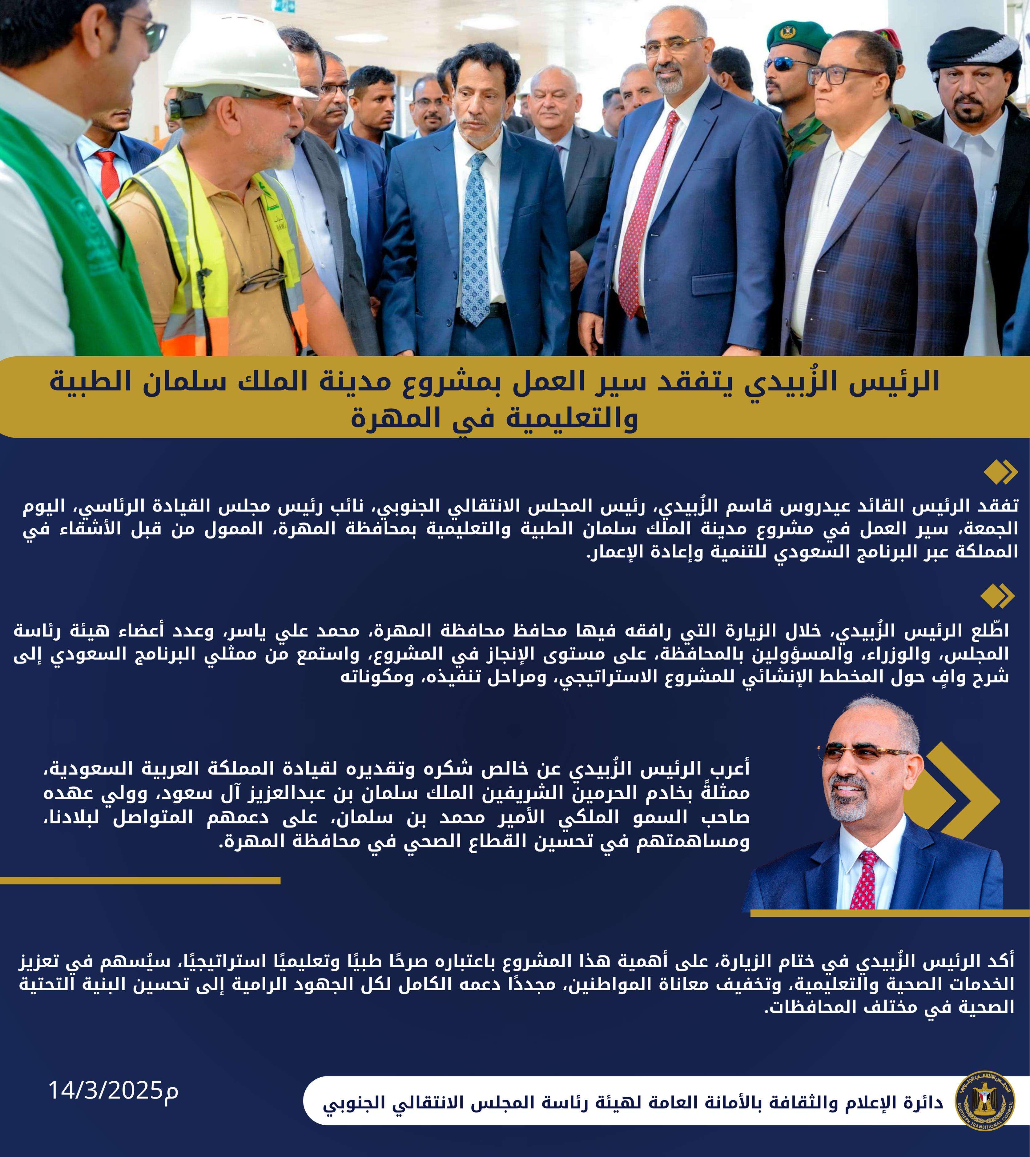 الرئيس الزُبيدي يتفقد سير العمل بمشروع مدينة الملك سلمان الطبية والتعليمية في المهرة