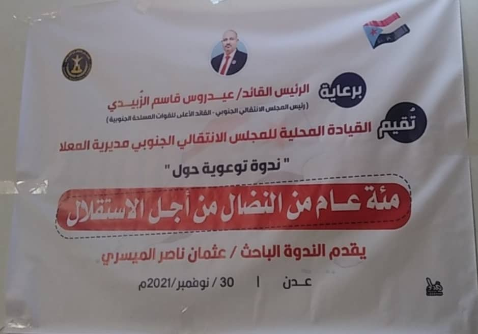 نظمت القيادة المحلية للمجلس الانتقالي الجنوبي في مديرية المعلا بالعاصمة عدن، اليوم الثلاثاء، ندوة سياسية تحت عنوان «مائة عام من النضال من أجل الاستقلال» بمناسبة الذكرى الـ54 لعيد الاستقلال الوطني الـ 30 من نوفمبر المجيد.