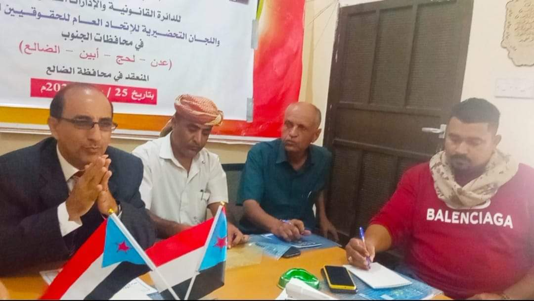 وترأس الاجتماع، الذي عُقد في مقر القيادة المحلية لانتقالي محافظة الضالع الدكتور صالح المرفدي رئيس الدائرة القانونية في الأمانة العامة، وبحضور مديري الإدارات القانونية بالمحافظات إلى جانب أعضاء اللجنة التحضيرية للاتحاد العام للحقوقيين الجنوبيين.