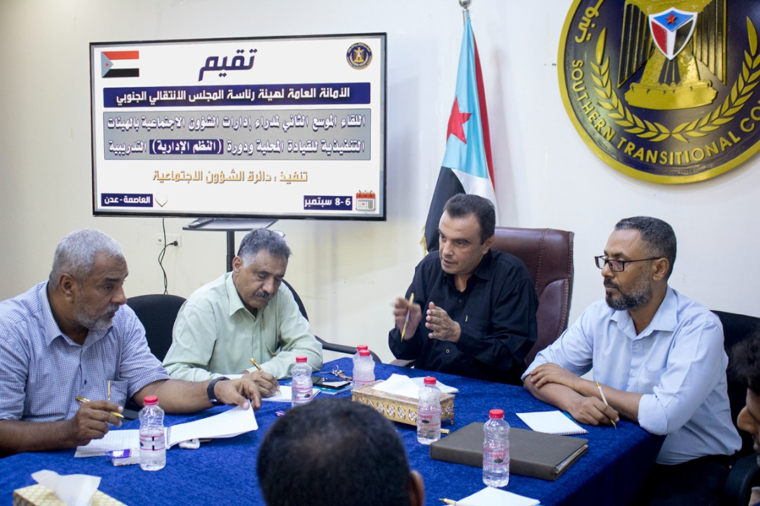 عقدت دائرة الشؤون الاجتماعية في الأمانة العامة لهيئة رئاسة المجلس الانتقالي الجنوبي، اليوم الثلاثاء، اللقاء التشاوري الثاني لمديري إدارات الشؤون الاجتماعية في الهيئات التنفيذية للقيادات المحلية للمجلس بمحافظات الجنوب، بحضور الأستاذ فضل محمد الجعدي، عضو هيئة الرئاسة، نائب الأمين العام.