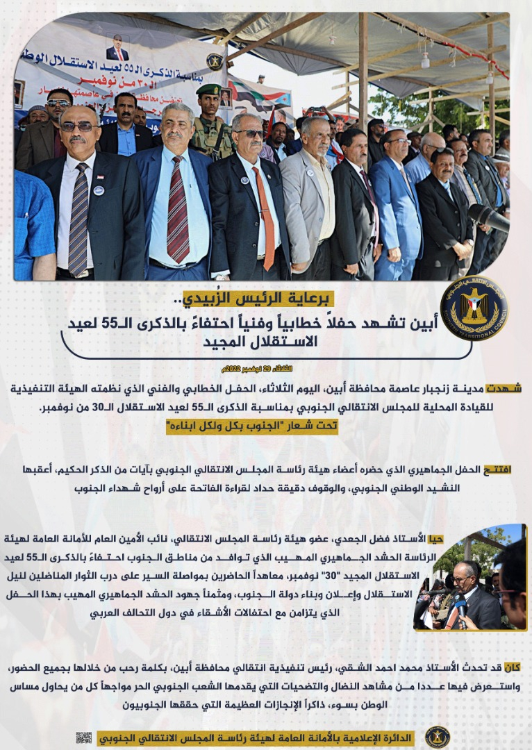 حفظ الصورة برعاية الرئيس الزُبيدي.. أبين تشهد حفلاً خطابياً وفنياً احتفاءً بالذكرى الـ55 لعيد الاستقلال المجيد الأربعاء ٣٠ نوفمبر ٢٠٢٢ الساعة ٠١:٤٦ صباحاً برعاية الرئيس الزُبيدي.. أبين تشهد حفلاً خطابياً وفنياً احتفاءً بالذكرى الـ55 لعيد الاستقلال المجيد