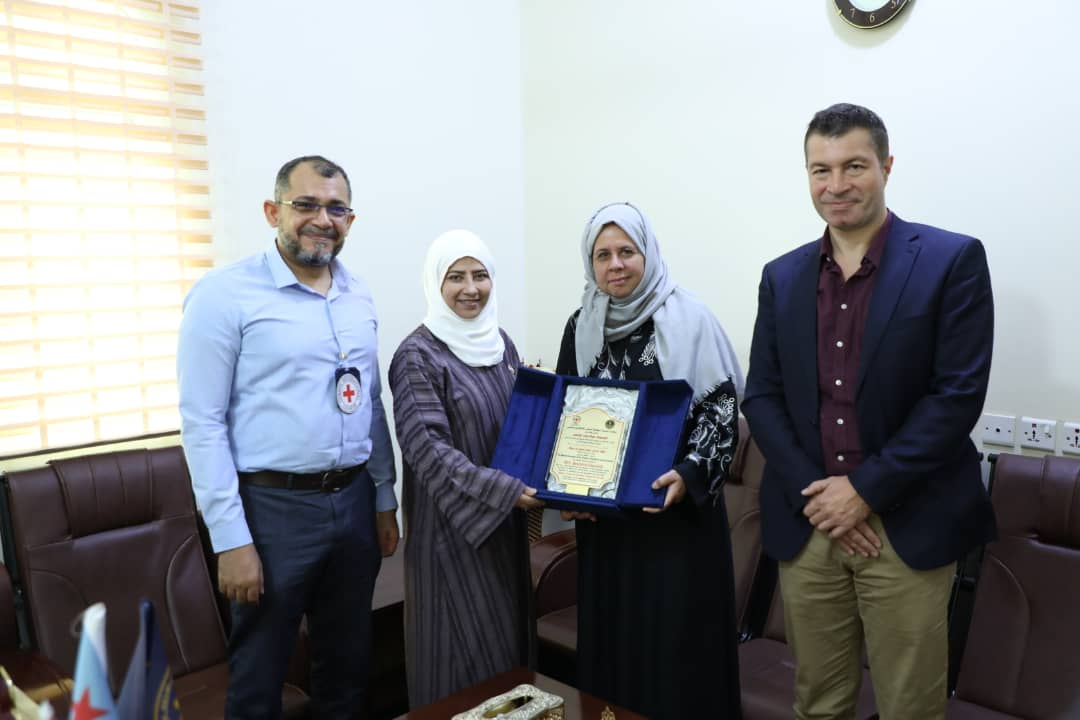 وفي ختام اللقاء، كرمت المحامية نيران، السيدة بياتريس، نيابة عن رئيس الجمعية اللواء الركن أحمد سعيد بن بريك، بدرعاً تذكارياً نظير جهودها الإنسانية التي بذلت طوال فترة تواجدها في العاصمة عدن.
