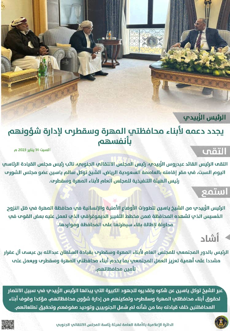 الرئيس الزُبيدي يجدد دعمه لأبناء محافظتي المهرة وسقطرى لإدارة شؤونهم بأنفسهم