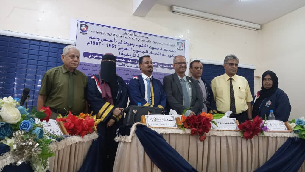 واستمعت اللجنة المناقشة التي تكونت من أ.مشارك.د.عباس علي المطري"رئيسٱ ومشرفٱ علميٱ" ،و أ. مشارك، رجاء صالح أحمد باطويل "عضواً ومناقشاً داخليا"، و أ.مشارك. أريكا أحمد صالح "عضوٱ ومناقشٱ خارجيٱ"، من الباحث نبيل السعيدي إلى شرح مفصل عن دور الصحيفة الريادي في دعم حكومة اتحاد الجنوب العربي المقدم من الطالب.