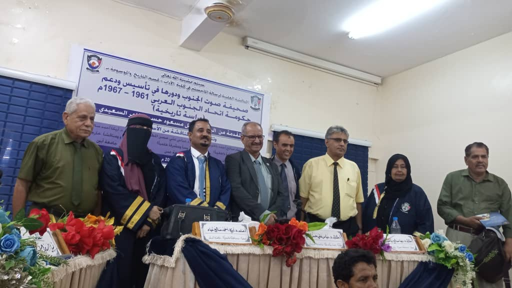 وفي سياق متصل شهدت كلية الآداب جامعة عدن بحضور الأستاذ فضل الجعدي، المناقشة العلنية لرسالة الماجستير الموسومة بـ: " صحيفة صوت الجنوب ودورها في تأسيس ودعم حكومة اتحاد الجنوب العربي من 1961م إلى 1967م"، المقدمة من الطالب نبيل مسعود حسين السعيدي.