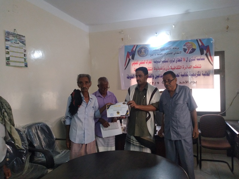 وجرى خلال الفعالية تكريم ثلاثة من أبرز رواد الثقافة والأدب بمديرية الحوطة، وهم الأديب كمال منيعم، والأديب والشاعر عبدالله محمود الشريف، والأستاذ محمد عوض شاكر.