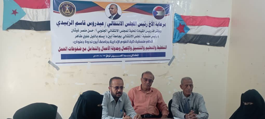 نظمت منسقية الانتقالي في كلية العلوم الإدارية بجامعة أبين، اليوم الخميس، ندوة بعنوان "التخطيط، والتعليم، والتنسيق، والاتصال وجدولة الأعمال والتعامل مع ضغوطات العمل".