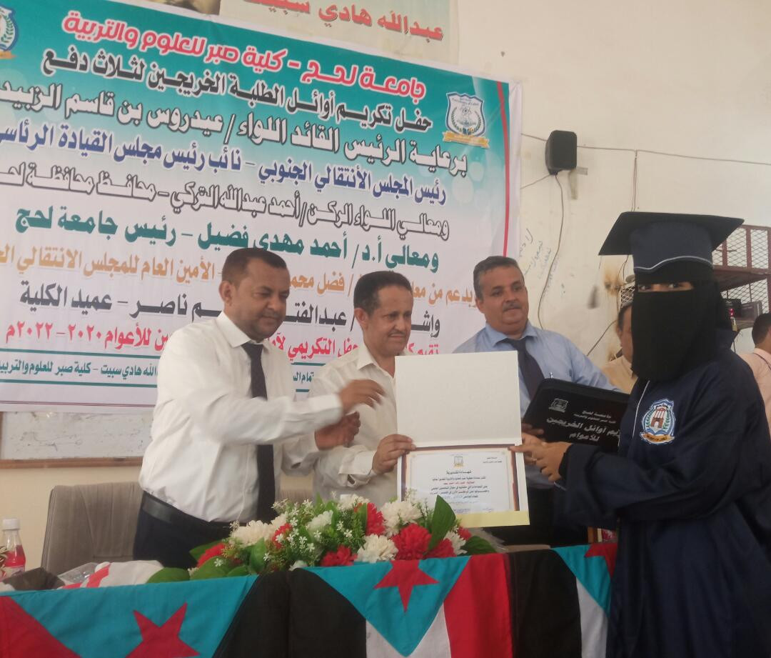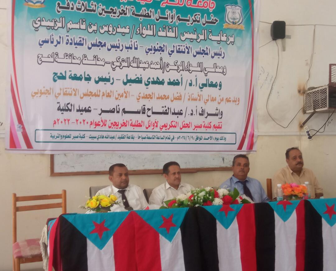نظمت كلية صبر للتربية والعلوم في جامعة لحج، اليوم الأحد، حفل تكريم لأوائل الطلاب الخريجين للأعوام 2020 - 2022م، برعاية كريمة من الرئيس القائد عيدروس الزُبيدي، رئيس المجلس الانتقالي الجنوبي.