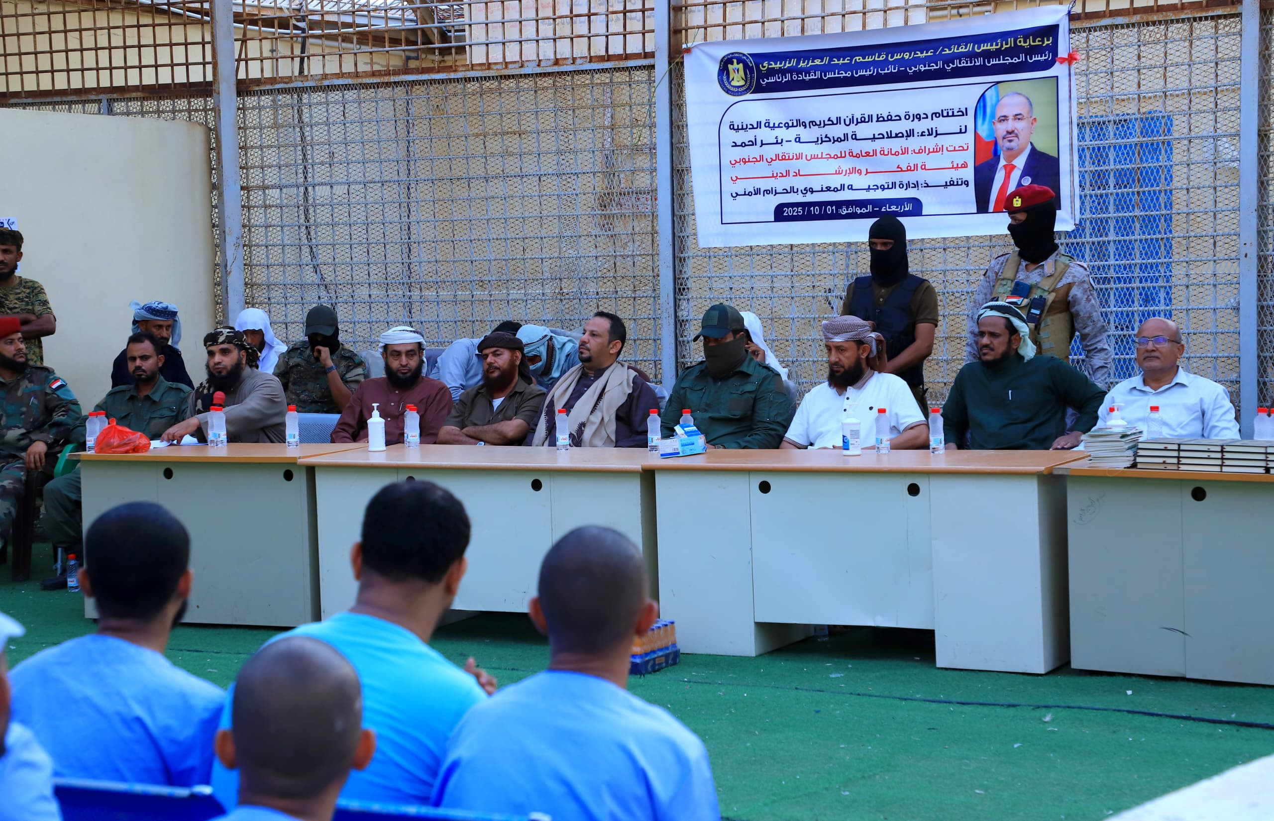اختتمت اليوم الأربعاء في الإصلاحية المركزية في بئر أحمد بالعاصمة عدن، دورة لحفظ القرآن الكريم والتوعية الدينية الموجهة لنزلاء الإصلاحية، وذلك بإشراف هيئة الفكر والإرشاد الديني في الأمانة العامة لهيئة رئاسة المجلس الانتقالي الجنوبي، وبتنفيذ من إدارة التوجيه المعنوي في قوات الحزام الأمني.