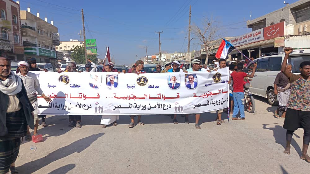 نظمت القيادة المحلية للمجلس الانتقالي الجنوبي في مديرية ميفعة بمحافظة شبوة، اليوم السبت، مسيرة جماهيرية حاشدة، احتفالاً بالانتصارات التي حققتها القوات المسلحة الجنوبية في عارين بمحافظة شبوة، ومديريات وادي وصحراء حضرموت.