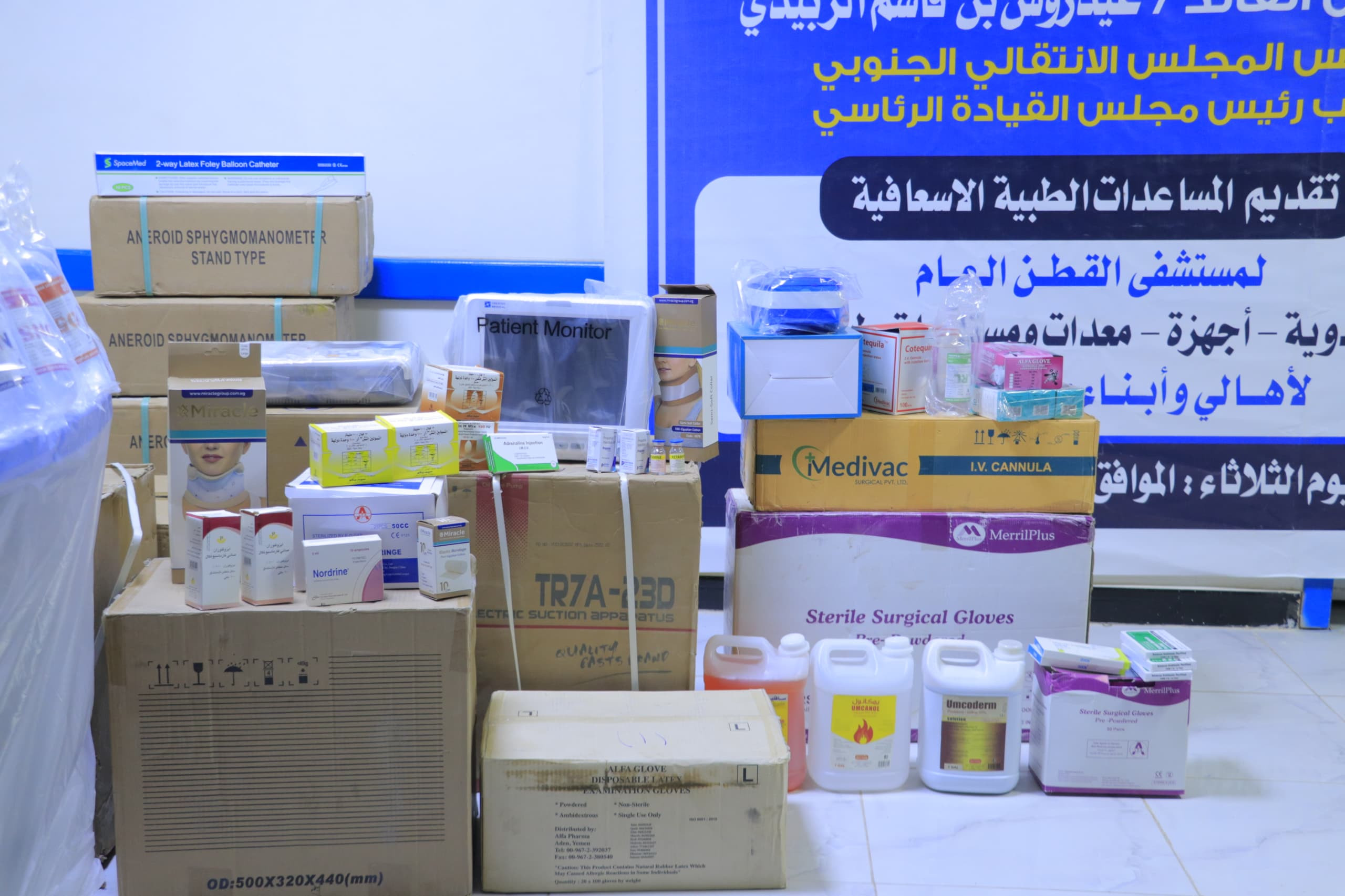 مقدمة من الرئيس الزُبيدي.. انتقالي وادي وصحراء حضرموت يسلّم مساعدات طبية لمستشفى القطن العام
