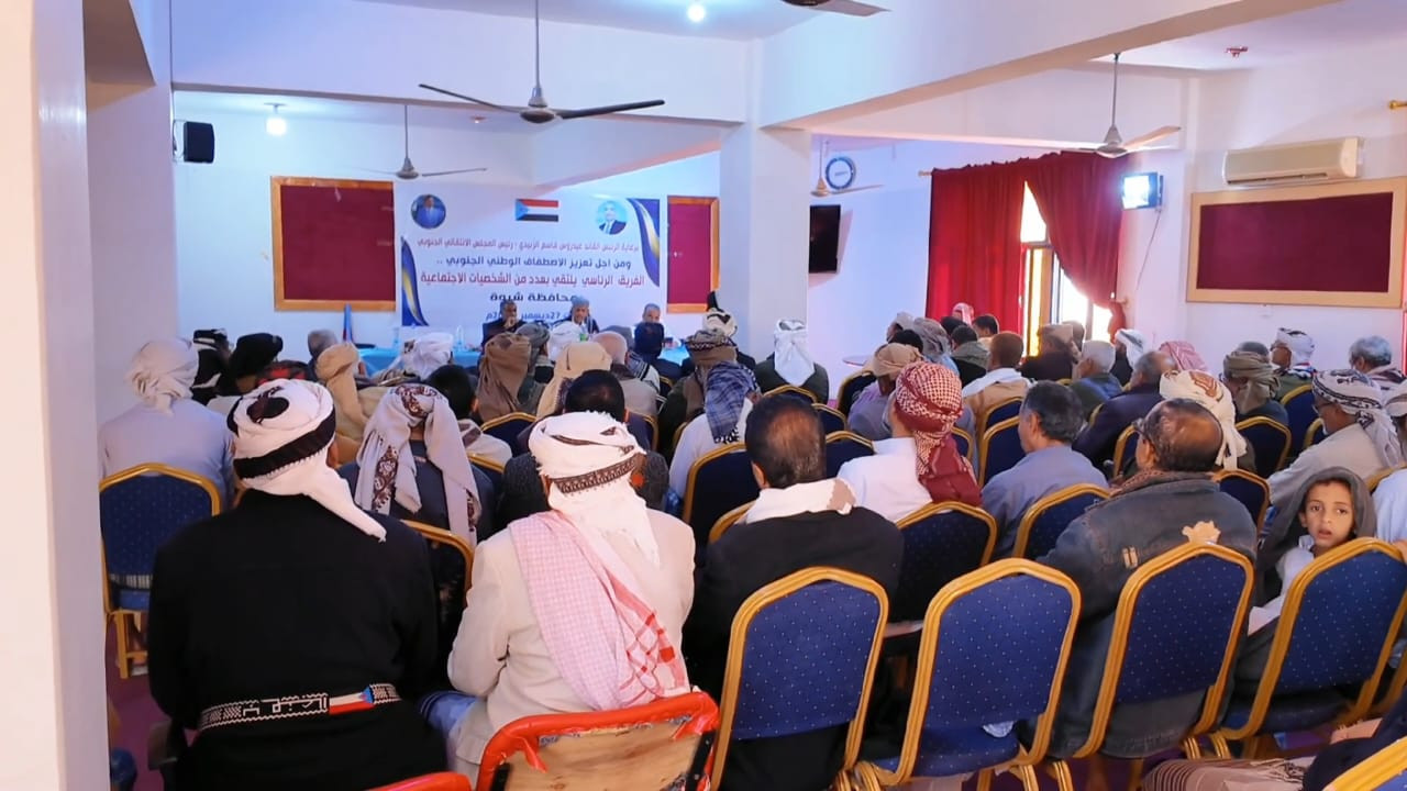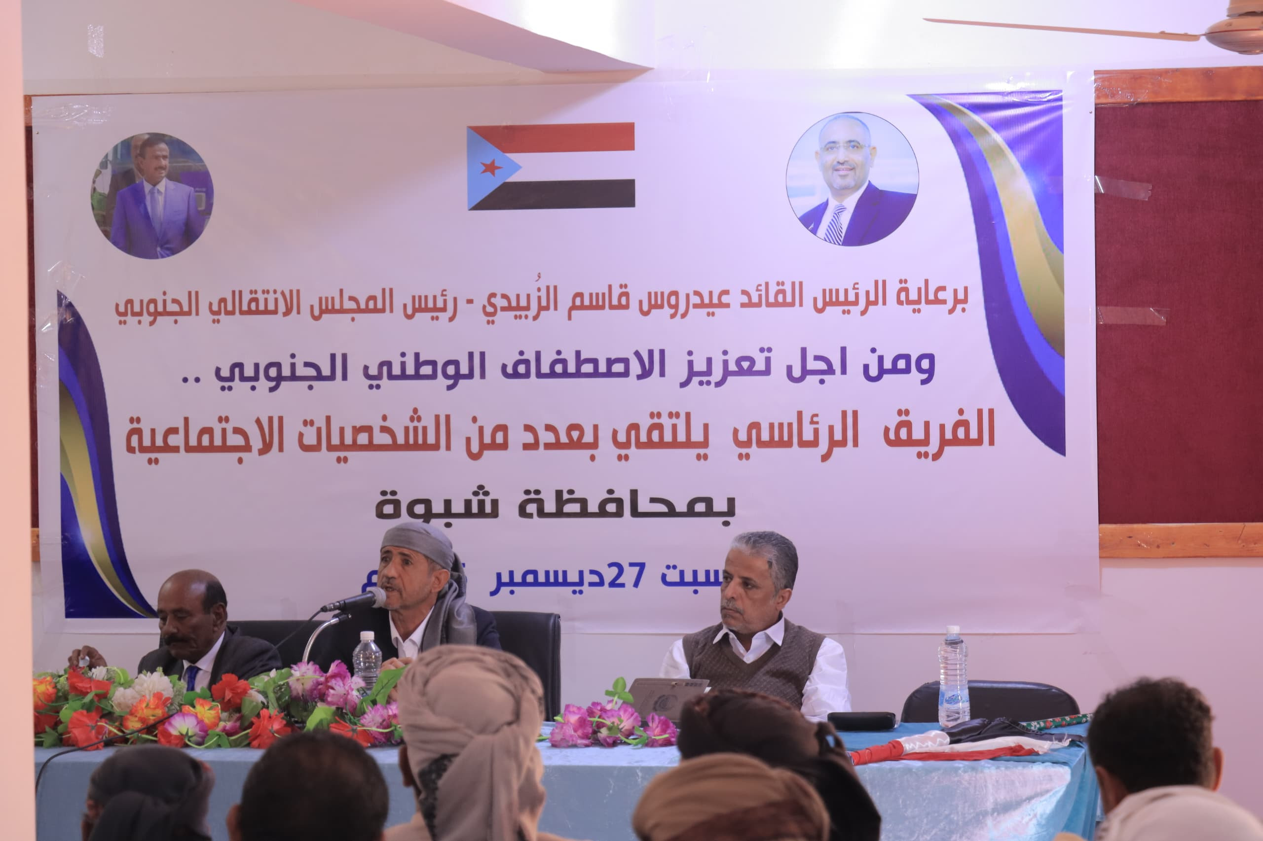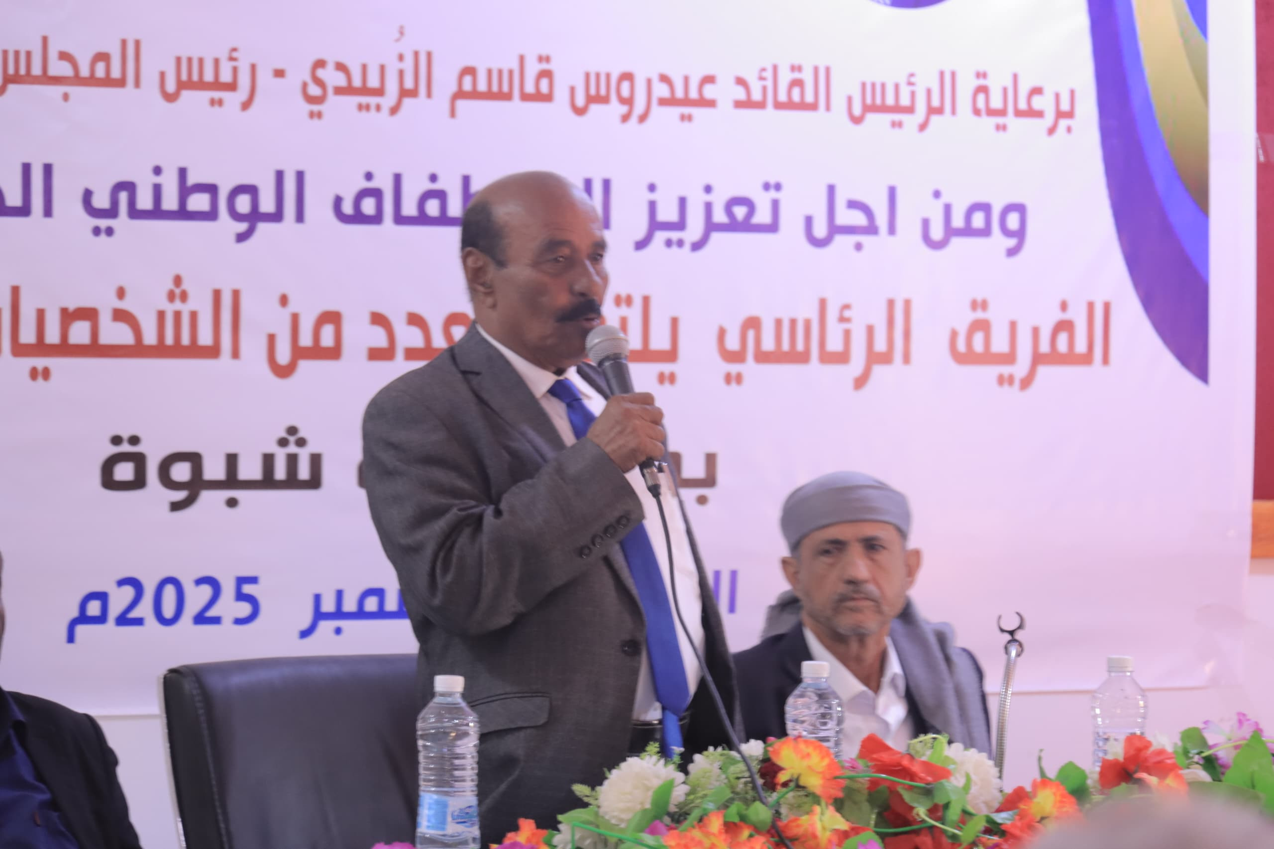 من جانبه ألقى مدير الإدارة السياسية بتنفيذية انتقالي شبوة، الأستاذ صالح بامعيلا، كلمة رحّب في مستهلها بالحاضرين، مؤكدًا أهمية دور الشخصيات الاجتماعية في تعزيز التلاحم الوطني وتوحيد الصف الجنوبي، ودعم توجهات القيادة السياسية للمجلس الانتقالي الجنوبي، بما يسهم في حماية المكتسبات والمضي نحو تحقيق تطلعات شعب الجنوب في استعادة دولته.