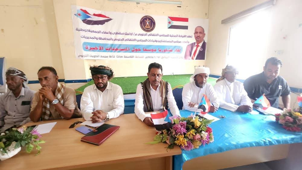 عقدت القيادة المحلية للمجلس الانتقالي الجنوبي بمحافظة أرخبيل سقطرى، اليوم السبت، لقاءً تشاورياً موسّعاً، بمشاركة قيادات وأعضاء القيادة المحلية، وأعضاء الجمعية الوطنية، وأعضاء مجلس المستشارين، وقيادات المجلس الانتقالي الجنوبي في المحافظة والمديريات، لمناقشة المستجدات والأحداث الطارئة التي تشهدها الساحة الجنوبية.