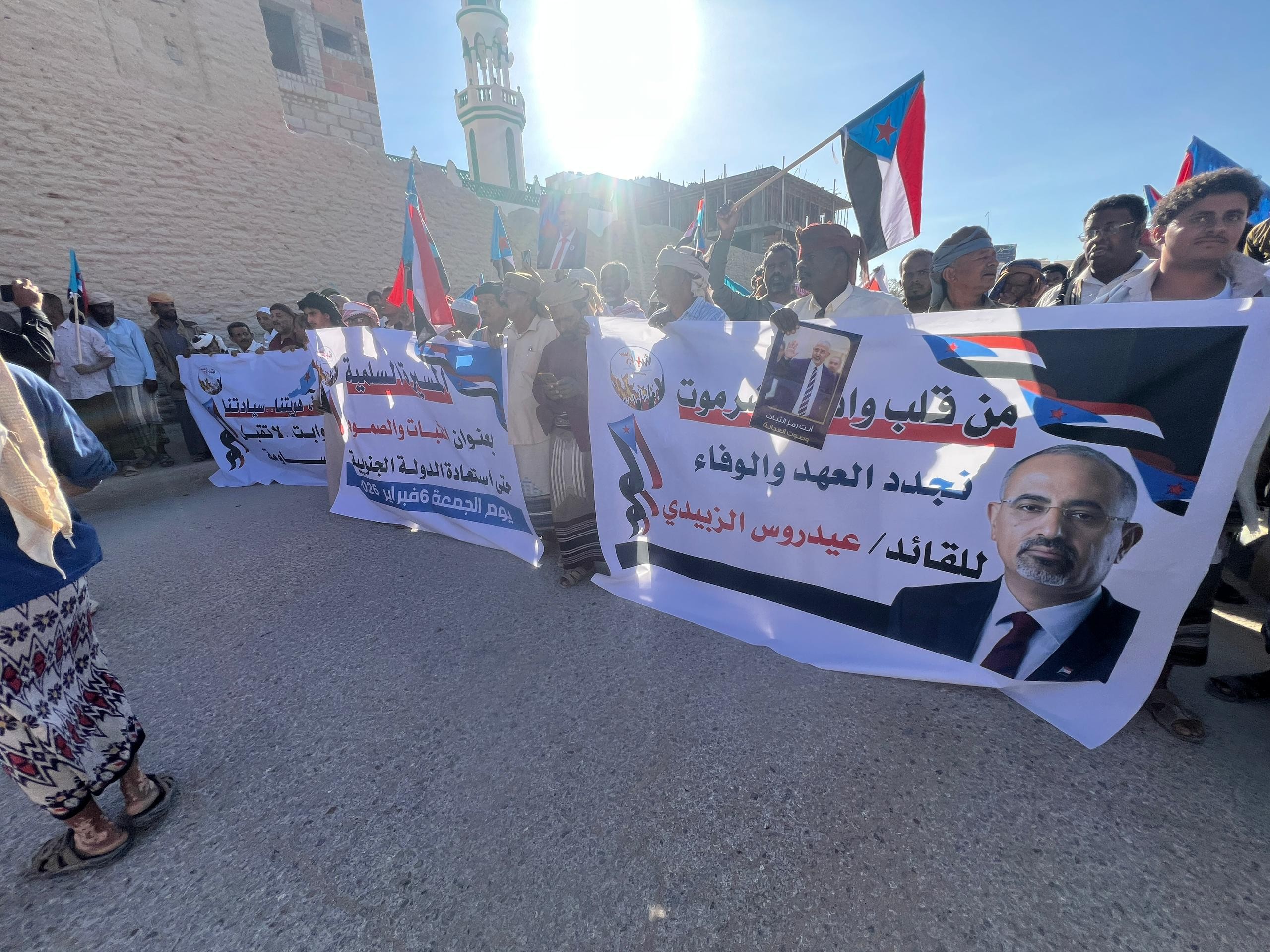 وأكد المشاركون أن هذه المسيرة تأتي تجديدًا للتفويض الشعبي للمجلس الانتقالي الجنوبي حاملا سياسيا لقضية شعب الجنوب، ورسالة واضحة برفض كل الأعمال الانتقامية ومحاولات كسر إرادة أبناء الجنوب أو الالتفاف على خياراتهم الوطنية، والتأكيد على وحدة الصف الجنوبي والاصطفاف خلف الرئيس القائد عيدروس قاسم الزُبيدي، وعلى أن حضرموت جزء أصيل من الجغرافيا والهوية الجنوبية.