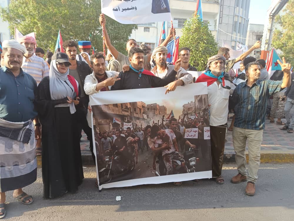 وردد الجماهير الشعارات التي أكدت تضامن أبناء العاصمة عدن الكامل مع أبناء حضرموت، ورفض كافة أشكال القتل والتنكيل والاعتقال التي تمارس بحقهم، داعية إلى وقف هذه الانتهاكات واحترام حقوق المواطنين، ومشدداً على ضرورة تكاتف الجهود لحماية أمن واستقرار حضرموت والدفاع عن كرامة أبنائها.