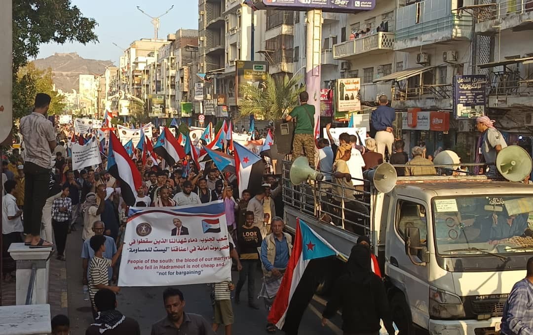 استجابةً لدعوة القيادة المحلية للمجلس الانتقالي الجنوبي في العاصمة عدن، خرجت مسيرة جماهيرية تضامنية للتنديد بما يتعرض له أبناء حضرموت من أعمال قتل وتنكيل واعتقال من قبل سلطات الأمر الواقع، معبرةً عن تضامن أبناء العاصمة عدن مع أشقائهم في حضرموت ورفضهم لهذه الممارسات.