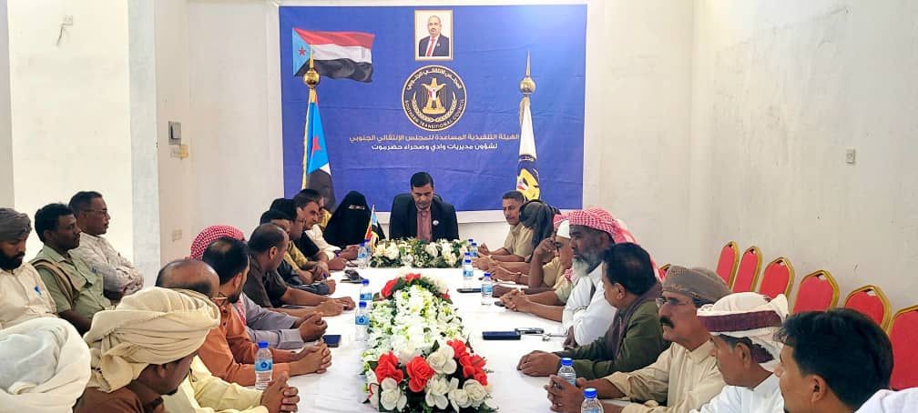 عقدت الهيئة التنفيذية المساعدة للمجلس الانتقالي الجنوبي لشؤون مديريات وادي وصحراء حضرموت، اليوم الاثنين، اجتماعًا موسعًا بمقرها في مدينة سيئون، برئاسة القائم بأعمال رئيس الهيئة، عبد الملك التميمي، وبمشاركة مديري إدارات الهيئة ونوابهم، ورؤساء القيادات المحلية للمجلس الانتقالي الجنوبي بمديريات وادي وصحراء حضرموت.