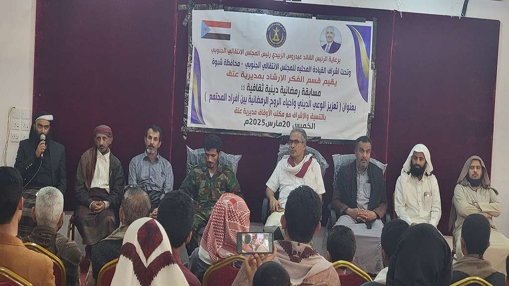 انتقالي عتق ينظم مسابقة رمضانية دينية وثقافية لتعزيز الوعي المجتمعي في المديرية نظم قسم الفكر والإرشاد الديني في الهيئة التنفيذية للقيادة المحلية للمجلس الانتقالي الجنوبي، في مديري...