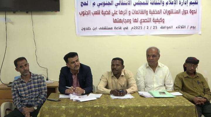 انتقالي لحج ينظم ندوة إعلامية عن أثر الشائعات على شعب الجنوب وسبل التصدي لها نظمت إدارة الإعلام والثقافة بالهيئة التنفيذية للقيادة المحلية للمجلس الانتقالي الجنوبي في محافظة لحج...