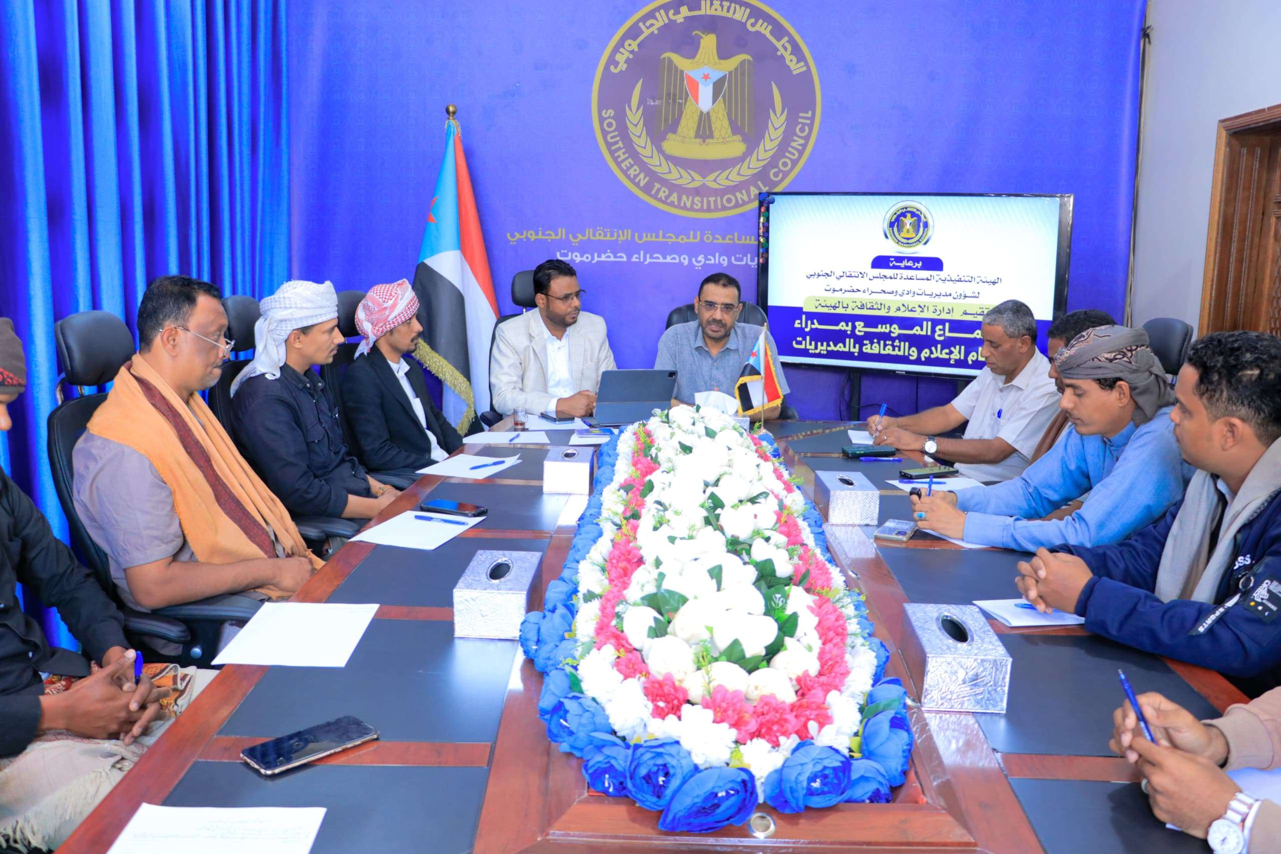 انتقالي وادي وصحراء حضرموت يعقد لقاءً تشاورياً برؤساء الأقسام الإعلامية والثقافية بالمديريات عقدت إدارة الإعلام والثقافة بالهيئة التنفيذية المساعدة للمجلس الانتقالي الجنوبي لشؤون مديريات وادي و...