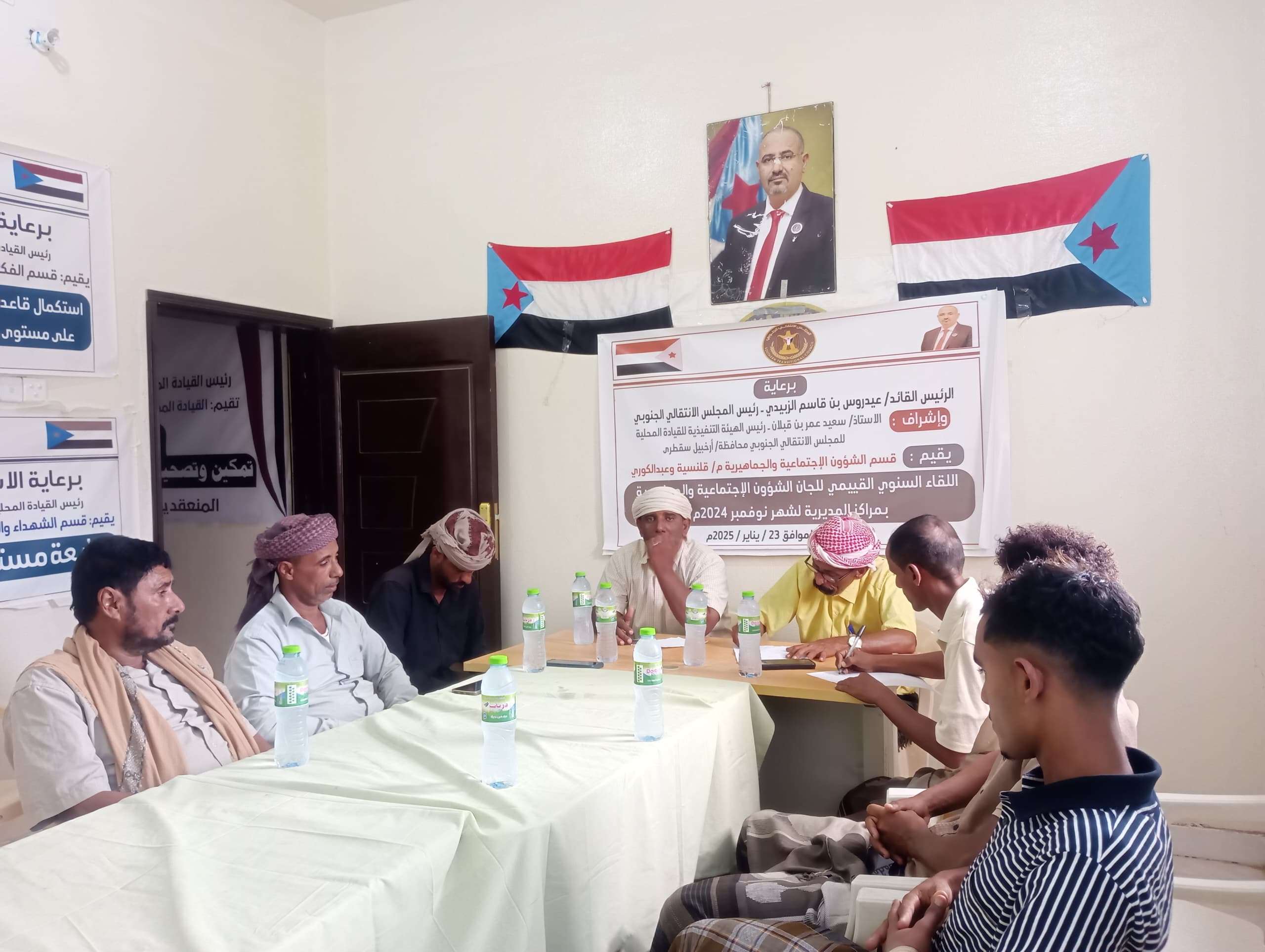 انتقالي قلنسية وعبدالكوري يعقد لقاءً تشاوريًا مع مسؤولي الشؤون الاجتماعية والجماهيرية باللجان المحلية للمجلس في مراكز المديرية عقد قسم الشؤون الاجتماعية والجماهيرية بالهيئة التنفيذية للقيادة المحلية للمجلس الانتقالي الجنوبي في...