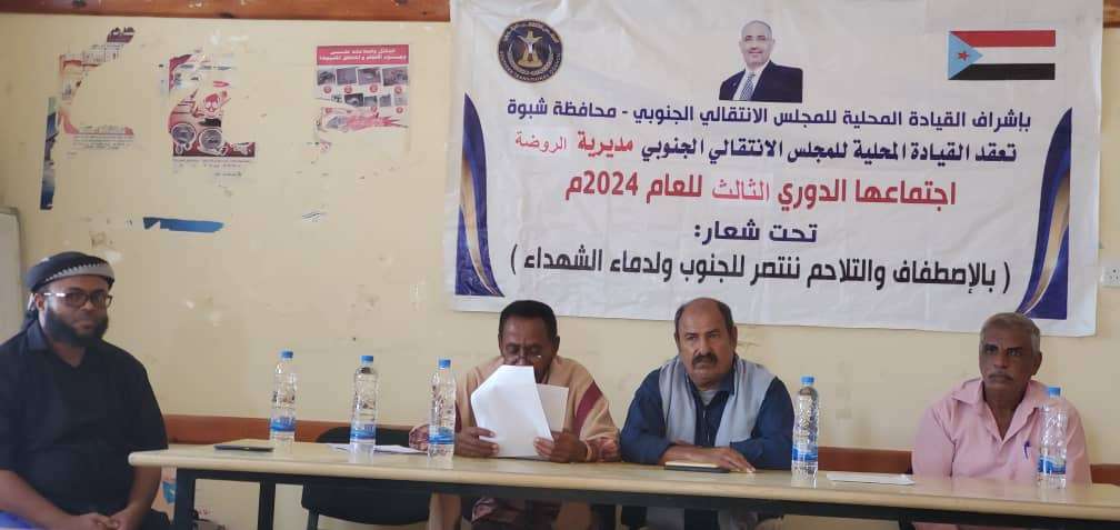 القيادة المحلية لانتقالي الروضة تعقد اجتماعها الموسع للفصل الثالث من العام 2024 عقدت القيادة المحلية للمجلس الانتقالي الجنوبي، في مديرية الروضة، بمحافظة شبوة، اجتماعها الموسع للفصل...