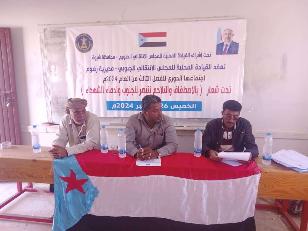 القيادة المحلية لانتقالي رضوم تعقد اجتماعها الموسع للفصل الثالث من العام الجاري عقدت القيادة المحلية للمجلس الانتقالي الجنوبي في مديرية رضوم بمحافظة شبوة، اليوم الخميس، اجتماعها ال...