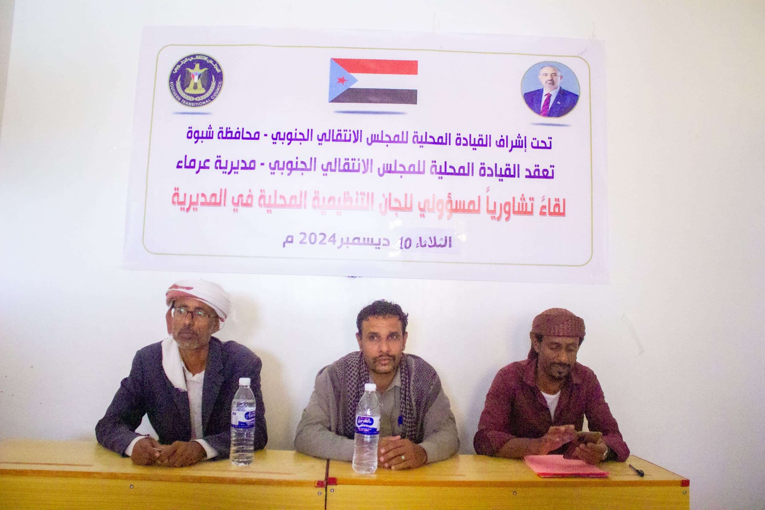 انتقالي عرماء ينظم لقاءً تشاوريًا لمسؤولي الشؤون التنظيمية باللجان المحلية بمراكز المديرية نظمت الهيئة التنفيذية للقيادة المحلية للمجلس الانتقالي الجنوبي في مديرية عرماء بمحافظة شبوة، اليوم ا...