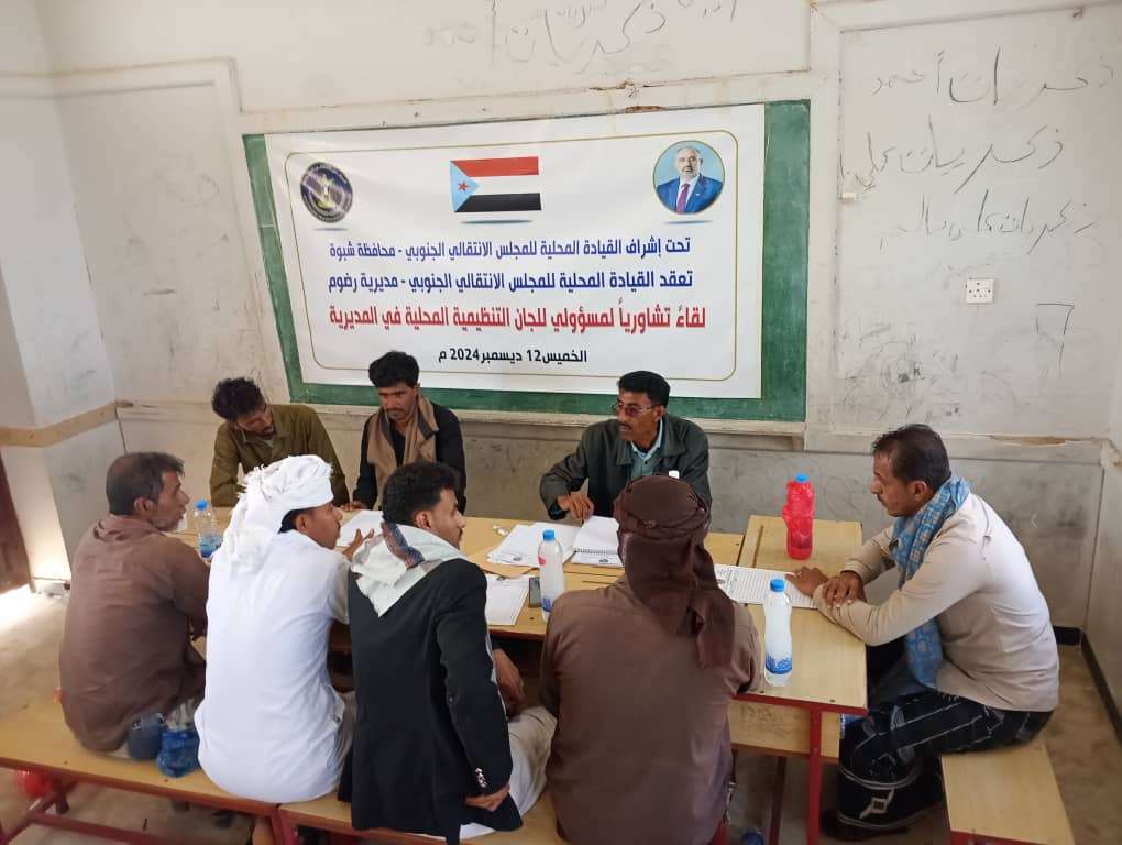 انتقالي رضوم ينظم لقاءً تشاوريًا لمسؤولي الشؤون التنظيمية باللجان المحلية بمراكز المديرية نظّمت الهيئة التنفيذية للقيادة المحلية للمجلس الانتقالي الجنوبي في مديرية رضوم بمحافظة شبوة، اليوم ا...