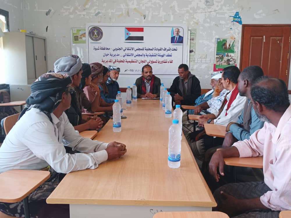 انتقالي حبان يعقد لقاءً تشاورياً لمسؤولي الشؤون التنظيمية باللجان المحلية بالمديرية عقدت الهيئة التنفيذية للقيادة المحلية للمجلس الانتقالي الجنوبي في مديرية حبان بمحافظة شبوة، اليوم ال...