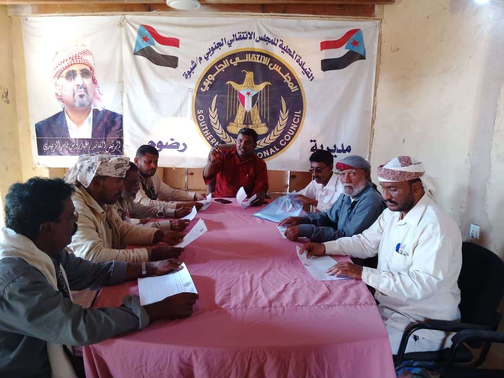 تنفيذية انتقالي رضوم تعقد اجتماعها الدوري لشهر نوفمبر عقدت الهيئة التنفيذية للقيادة المحلية للمجلس الانتقالي الجنوبي في مديرية رضوم بمحافظة بشبوة، اليوم ا...
