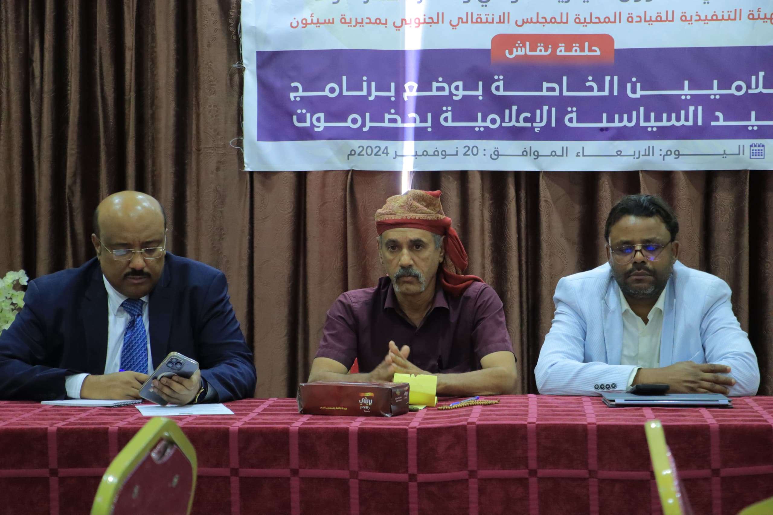 انتقالي سيئون ينظم حلقة نقاشية بعنوان "توحيد السياسة الإعلامية" نظم قسم الإعلام بالهيئة التنفيذية للقيادة المحلية للمجلس الانتقالي الجنوبي في مديرية سيئون بمحافظة ح...