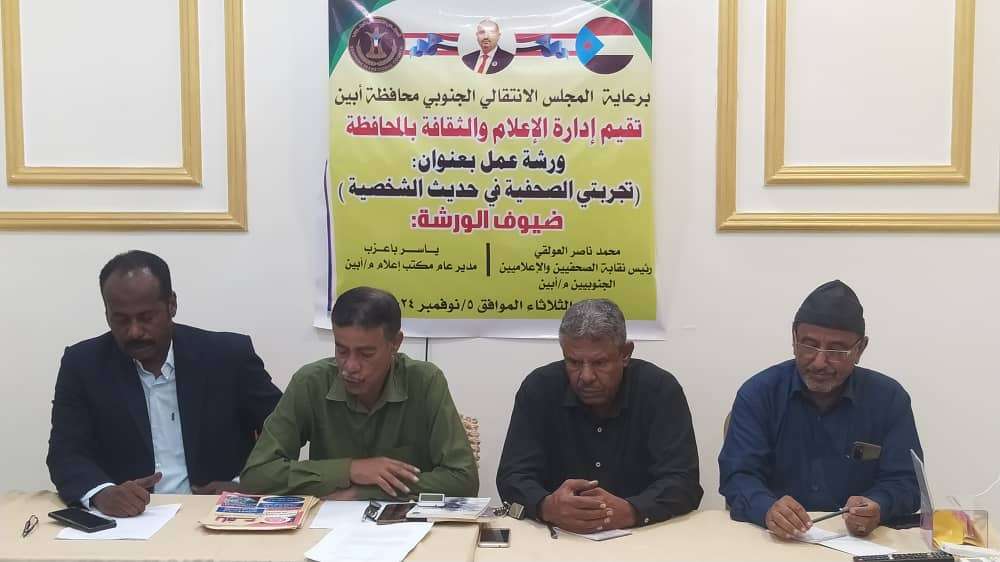 انتقالي أبين ينظم ورشة عمل بعنوان "تجربتي الصحفية" مع حديث الشخصية نظمت إدارة الإعلام والثقافة بالهيئة التنفيذية للقيادة المحلية للمجلس الانتقالي الجنوبي، في محافظة أب...