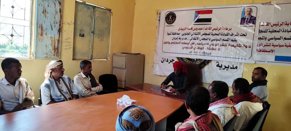 انتقالي جردان ينظم ندوة تثقيفية لتعزيز الاصطفاف الوطني نظم القسم السياسي بالهيئة التنفيذية للقيادة المحلية للمجلس الانتقالي الجنوبي في مديرية جردان بمحافظة...