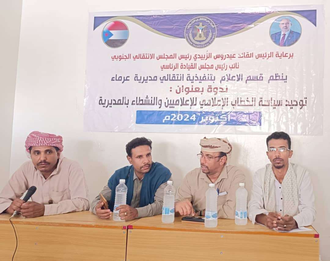 انتقالي عرماء ينظم ندوة بعنوان "توحيد الخطاب الإعلامي" نظّم القسم الإعلامي بالهيئة التنفيذية للقيادة المحلية للمجلس الانتقالي الجنوبي في مديرية عرماء بمحاف...