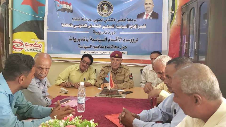 انتقالي الضالع يختتم دورة تدريبية لرؤساء الأقسام السياسية في مجالات ومفاهيم السياسة اختتمت الإدارة السياسية بالهيئة التنفيذية للقيادة المحلية للمجلس الانتقالي الجنوبي في محافظة الضالع،...