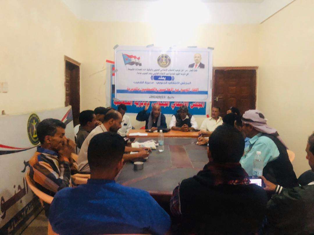 انتقالي الشعيب يعقد لقاءً تشاورياً مع إعلاميي المديرية عقدت الهيئة التنفيذية للقيادة المحلية للمجلس الانتقالي الجنوبي في مديرية الشعيب بمحافظة الضالع، اليو...