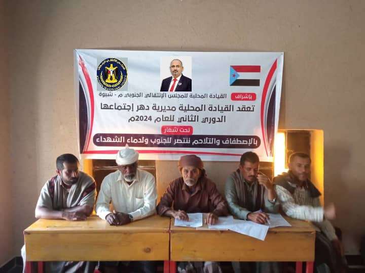 القيادة المحلية لانتقالي دهر تعقد اجتماعها الموسع للفصل الثاني من العام الجاري عقدت القيادة المحلية للمجلس الانتقالي الجنوبي في مديرية دهر بمحافظة شبوة، اليوم الاثنين، اجتماعها ال...