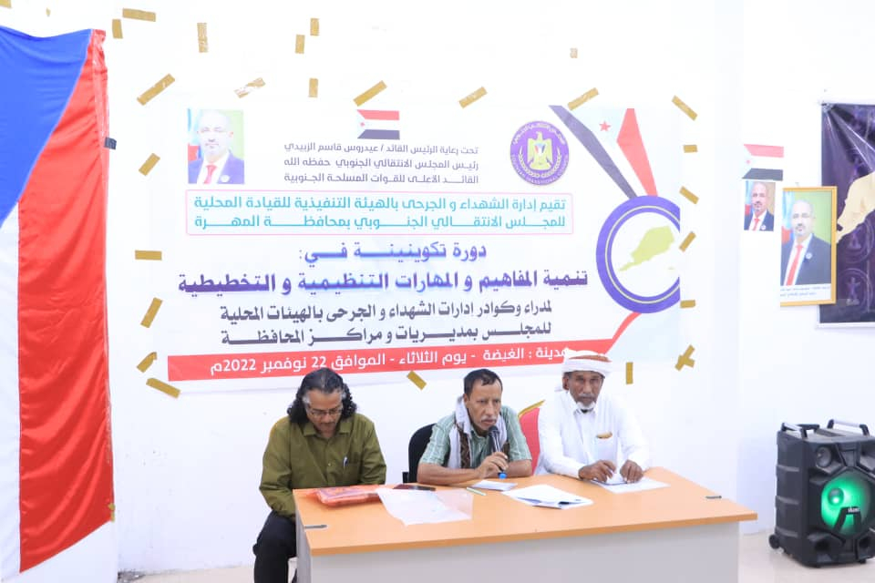 انتقالي المهرة ينظم دورة تدريبية في تنمية المفاهيم التنظيمية والتخطيطية نظمت إدارة الشهداء والجرحى بانتقالي محافظة المهرة، اليوم الثلاثاء، دورة تدريبية لمديري الإدارات والك...