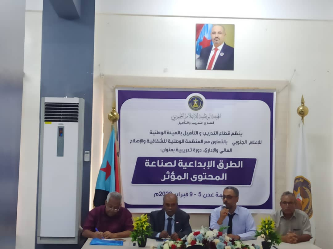 قطاع التدريب والتأهيل يدشن دورة تدريبية حول الطرق الإبداعية لصناعة المحتوى المؤثر دشن قطاع التدريب والتأهيل بالهيئة الوطنية للإعلام الجنوبي بالتعاون مع المنظمة الوطنية للشفافية والإص...