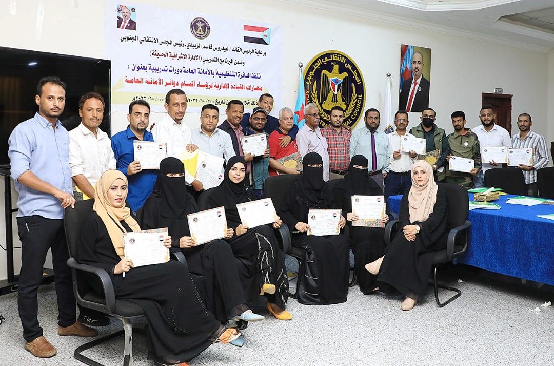 الأمانة العامة تختتم المرحلة الأولى للدورات التدريبية في "مهارات القيادة الإدارية" لرؤساء أقسام دوائر الأمانة اختتمت الدائرة التنظيمية في الأمانة العامة لهيئة رئاسة المجلس الانتقالي الجنوبي، اليوم الخميس، المرح...
